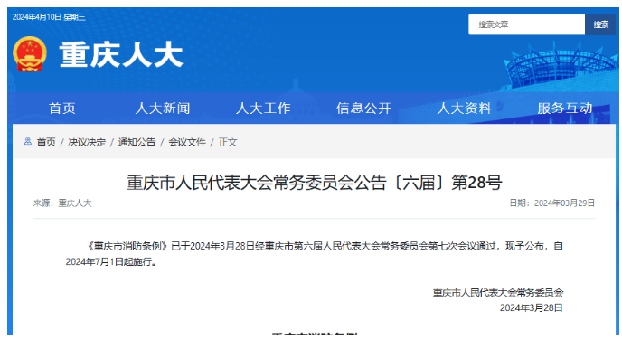 《重庆市消防条例》已于2024年3月28日经重庆市第六届人民代表大会常务委员会第七次会议通过,现予公布,自2024年7月1日起施行。(1998年9月25日重庆市