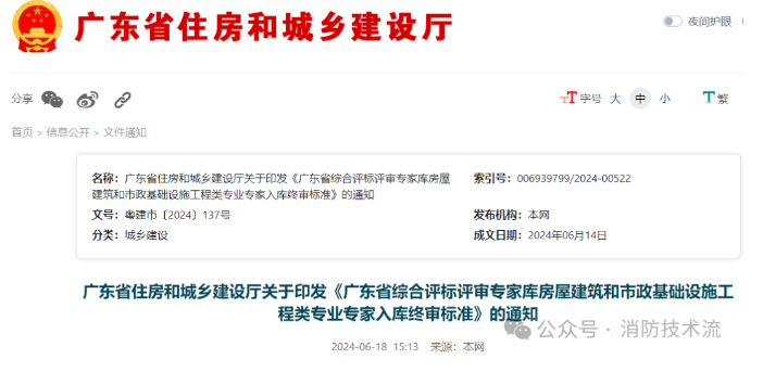各地级以上市住房和城乡建设局,广州、佛山、惠州、东莞市交通运输局,广州、深圳、佛山、东莞市水务局,广州、佛山、东莞市城市管理和综合执法局,广州市林业和园林局,佛山市政务服务数据管理局,各有关单位: 为规范广东省综合评标评审专家库中归口省住房城乡建设厅管理专业的专家入库、专业变更、续聘的审核工作,根据《广东省综合评标评审专家和评标评审专家库管理办法》(粤府办〔2020〕1号)等有关文件规定,我厅制定了《广东省综合评标评审专家库房屋建筑和市政基础设施工程类专业专家入库终审标准》。2024年8月1日起,广东省综合评标评审专家库中归口我厅管理专业评标评审专家的入库审核适用本标准。